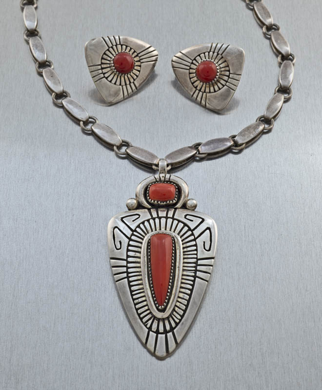 No one was better at adapting Patania designs and making them uniquely theirs than was Julian Lovato (Santo Domingo Pueblo). This coral and silver necklace and earring set exemplifies the best of Lovato’s designs. The pendant hangs from one of Marie Lovato’s dot-and-dash chains. Courtesy White collection.