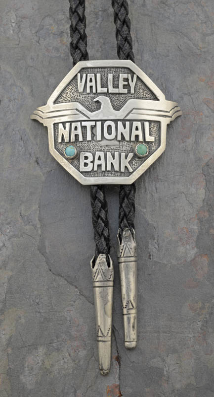 Harry Sakyesva (Hopi) crafted this bolo tie with the Valley National Bank logo in the 1960s. He would have become experienced in cutting out letters while making monogrammed pieces at the Thunderbird Shop in the 1950s. Authors’ collection.