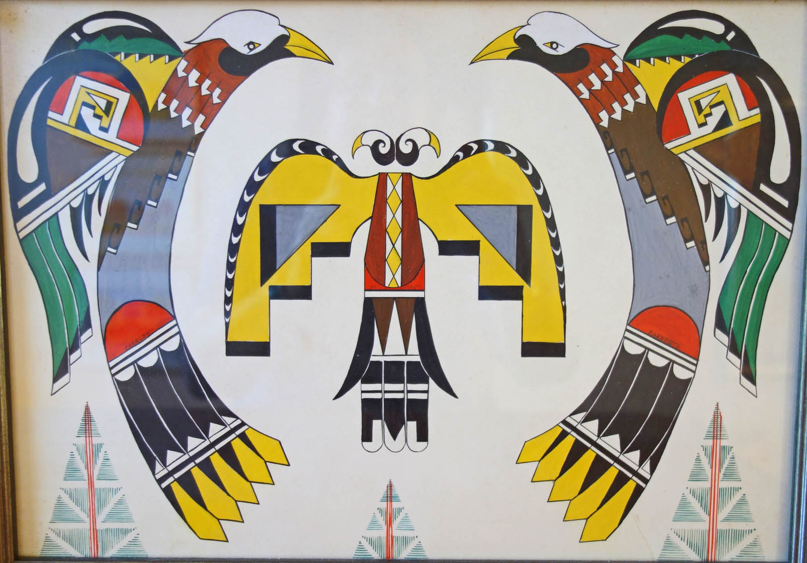 Strausenback was fascinated with Pueblo Indian designs and painting techniques. Many of his paintings, and even his company logo, are reminiscent of Awa Tsireh’s artwork, if not direct copies. This 1935 opaque watercolor painting, signed Charley Ernesta, incorporates Pueblo bird and butterfly designs. (Private collection)