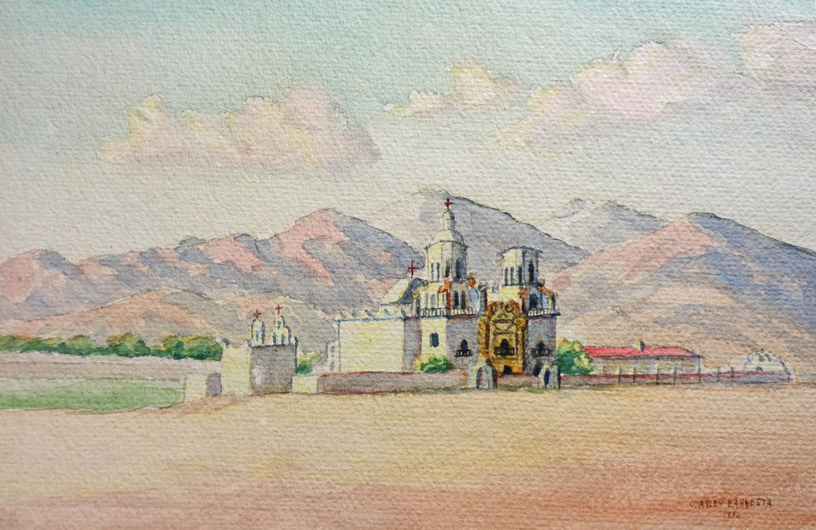 Previous Image Next Image S-42 sm Two watercolor paintings of scenes from Arizona, saguaros in the Phoenix area, and San Xaxier del Bar Mission in Tucson. (Authors collection)